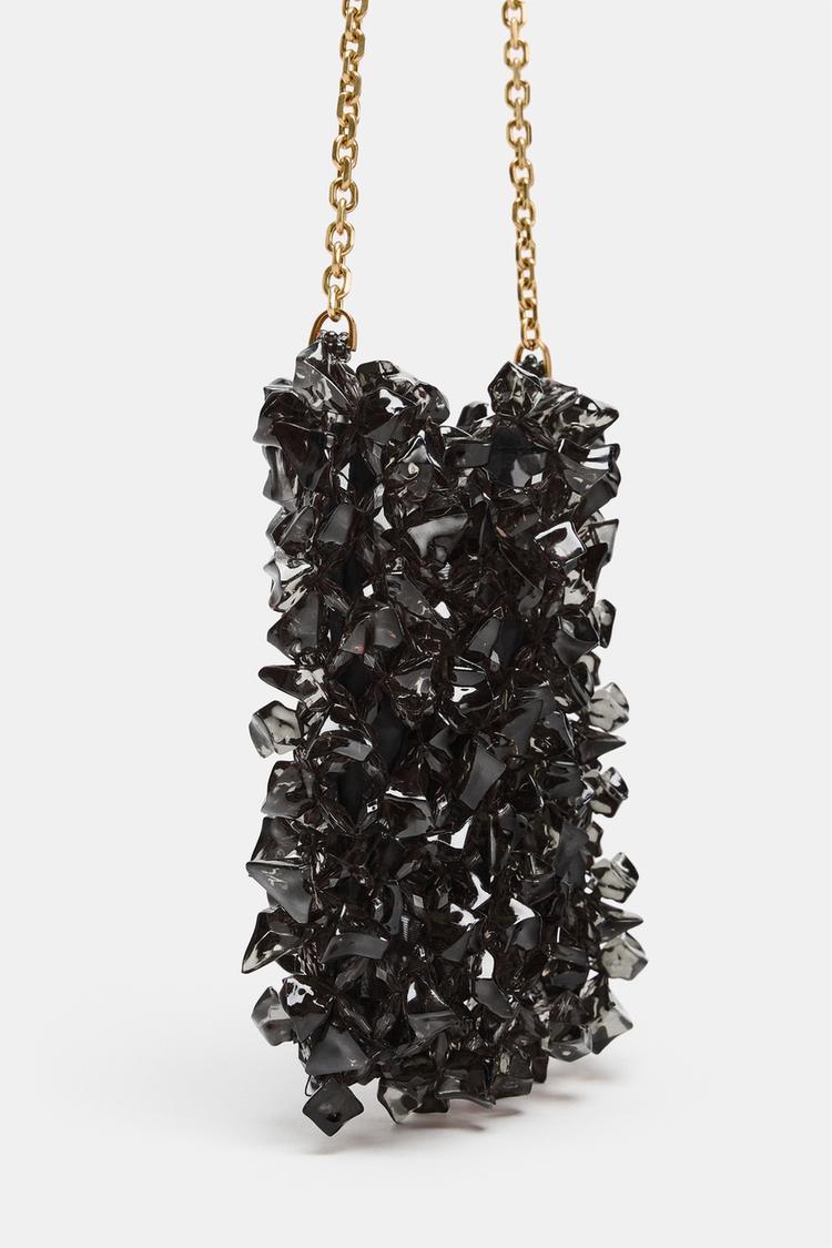 Mini bucket bag with a shiny beaded exterior. Chain crossbody strap.